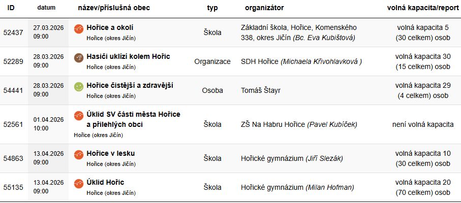 Mimo žáků Speciální školy Hořice, kteří sbírali odpadky ve středu 25.3.2026 na Gothardě, se akce účastní i další školy, organizace i jednotlivci na Hořicku. Jejich seznam s uvedením data konání, jménem organizátora a případnou volnou kapacitou pro další zájemce přináší následující tabulka:
