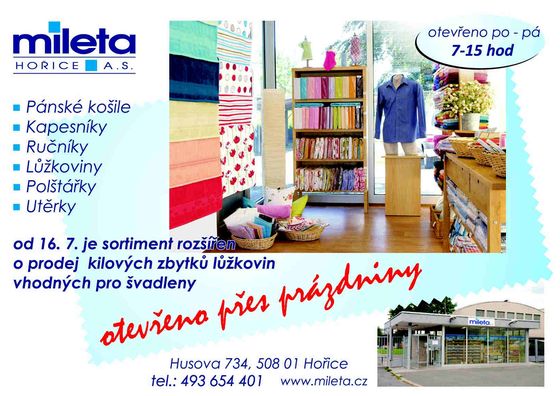 Textilní společnost Mileta Hořice vznikla v roce 1949 sloučením několika továren, její tradice však sahá až do počátku 19. století. V současnosti patří mezi největší evropské výrobce kapesníků, košilovin a batistů a prezentuje se jako přední světový výrobce luxusních jemných bavlněných tkanin pro dámskou i pánskou módu.